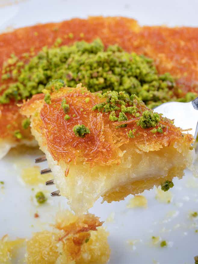 This dessert is as decadent as they come! The Kanafeh or Kunafa is made with thin noodle-like pastry that is soaked in sweet sugary-syrup and layered with cheese, clotted cream, and nuts. The medley of textures is unlike any other dessert you would have tasted.