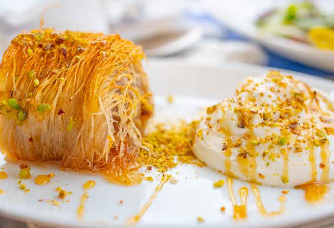 The Queen of Arabic Desserts, Knafeh stands out due to its cheese-based pastry and unique sweet-salt taste. Often garnished with pistachios and rose-scented syrups, it’s the most popular sweet of the region. You can sample a slice of this goodness at Just Kunafa, Downtown Dubai.