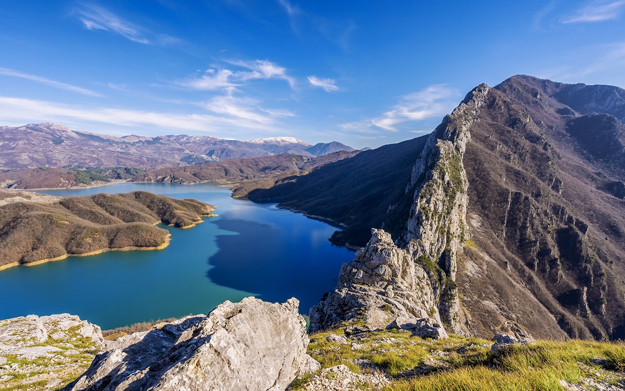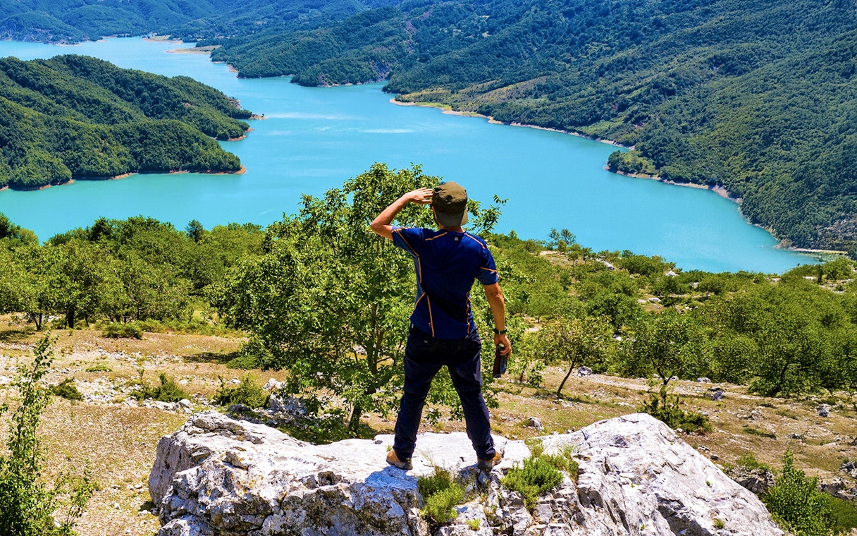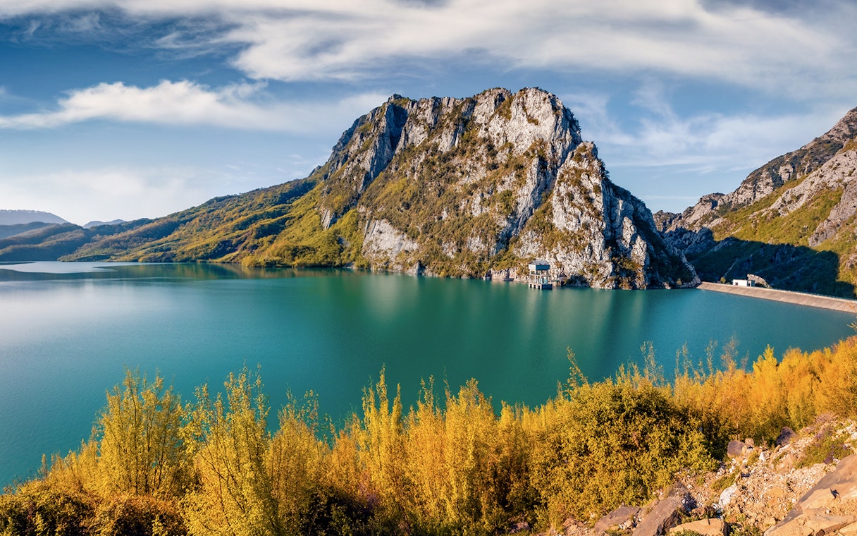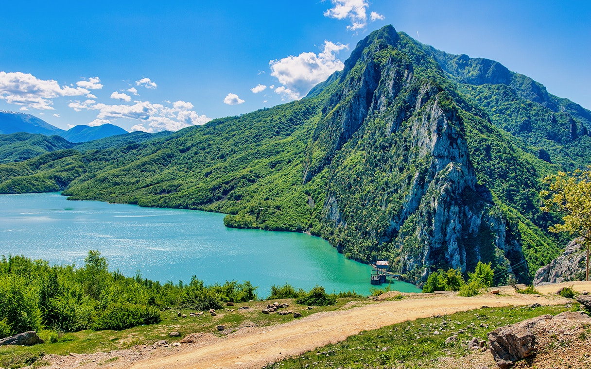 Hold pause for at beundre søens levende blå overflade, et reservoir vugget af klipper, der stadig leverer en stor del af Tiranas drikkevand i dag.
