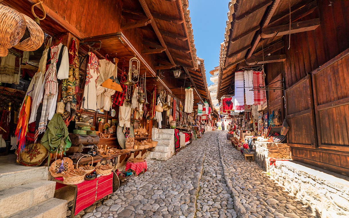 Gå en tur gennem de brostensbelagte gyder i Krujas charmerende gamle basar, hvor du kan kigge på traditionelt kunsthåndværk og smage på lokale delikatesser.