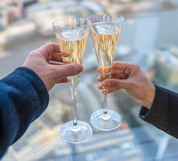 Fahren Sie mit dem Aufzug in die 56. Etage und betreten Sie die überdachte Aussichtsplattform, die von weitläufigen Glasfenstern umgeben ist.