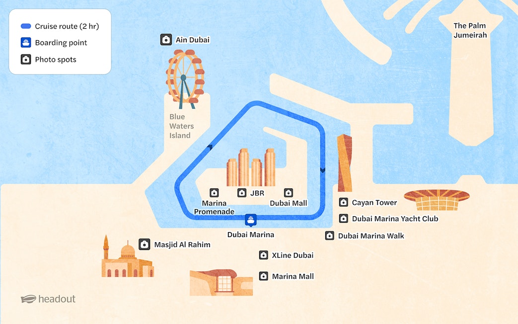 Optez pour une croisière de 2 heures qui passe devant l'île Bluewaters, le Burj Al Arab et le Dubai Eye, ou passez à une croisière de 3 heures pour naviguer plus loin et profiter des vues sur Atlantis.