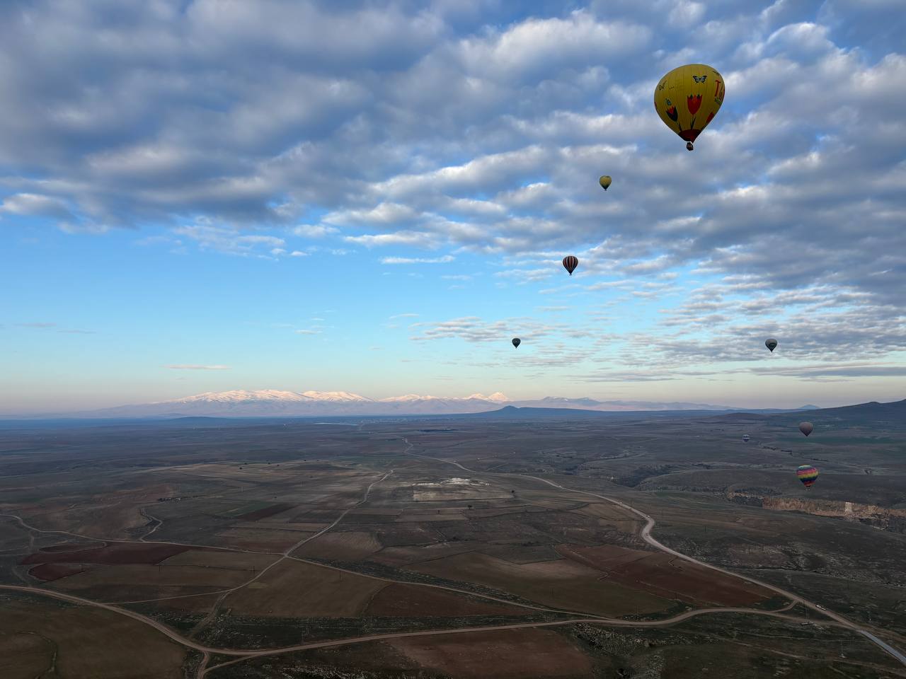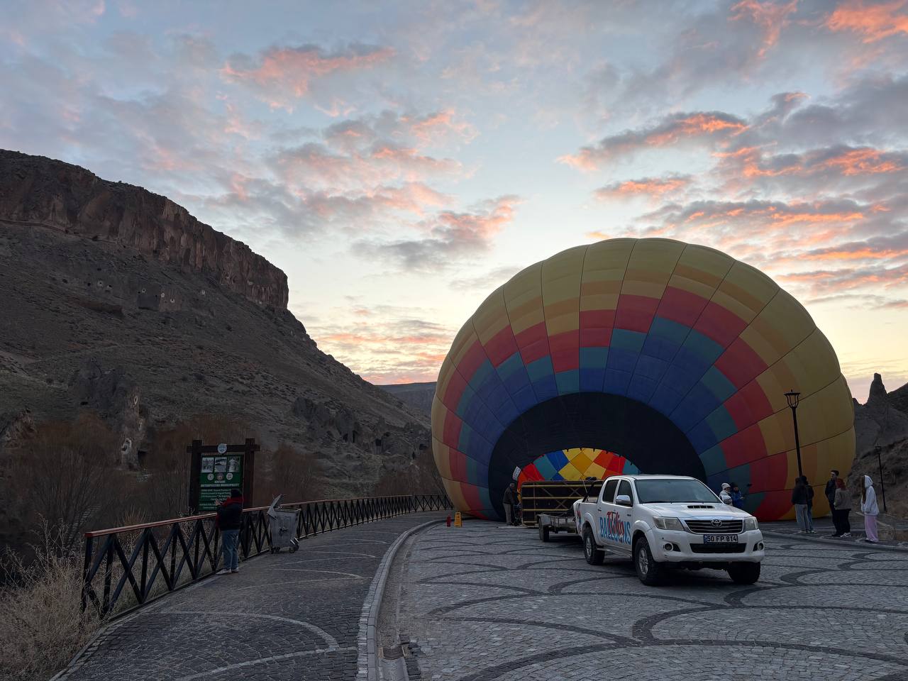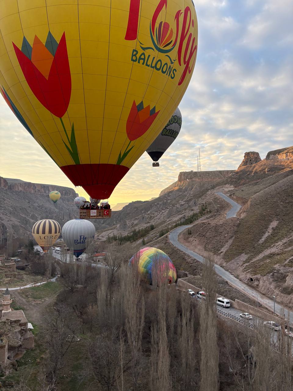 Avant le vol, on nous a servi des gözleme accompagnés de thé. Nous avons assisté au gonflage des montgolfières, ce qui est également très intéressant. Le vol a d'abord longé la gorge, ponctué d'explications sur la cité antique ; les 12 montgolfières se sont élevées dans les airs presque simultanément, survolant le relief de près : un spectacle unique, riche en émotions et en photos. Puis, nous avons pris de l'altitude jusqu'à environ 1 000 m ; on voyait la gorge d'en haut, les montagnes tout autour, certaines même enneigées. Tout cela à l'aube, comme annoncé dans le programme de l'excursion. Après l'atterrissage, nous sommes restés dans les nacelles pendant qu'on les chargeait sur la remorque pour le transport ; on nous a montré comment on dégonflait la montgolfière. Ensuite, chacun a reçu un certificat nominatif attestant de sa participation au vol, et nous avons tous bu du champagne sans alcool. Nous avons été ramenés à nos hôtels.