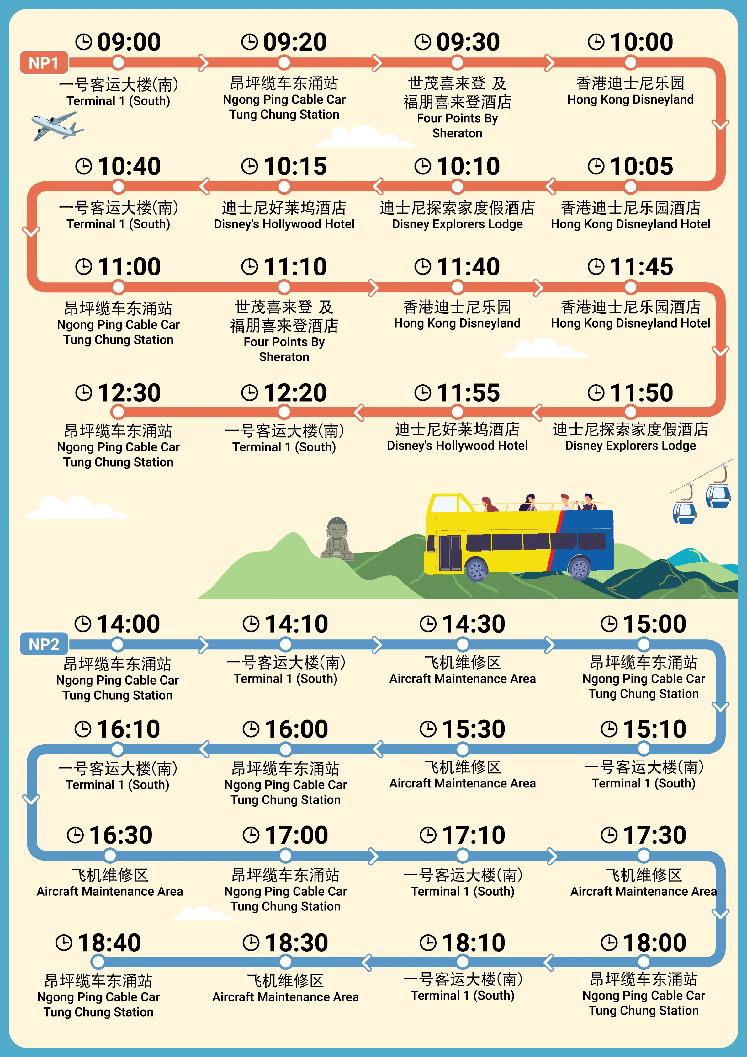 Bus departure: 11:30am from Hong Kong Disneyland, 11:35am from Hong Kong Disneyland Hotel, 11:38am from Disney Explorers Lodge, 11:40am from Disney's Hollywood Hotel & 11:55am from Ngong Ping 360