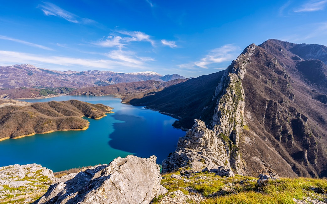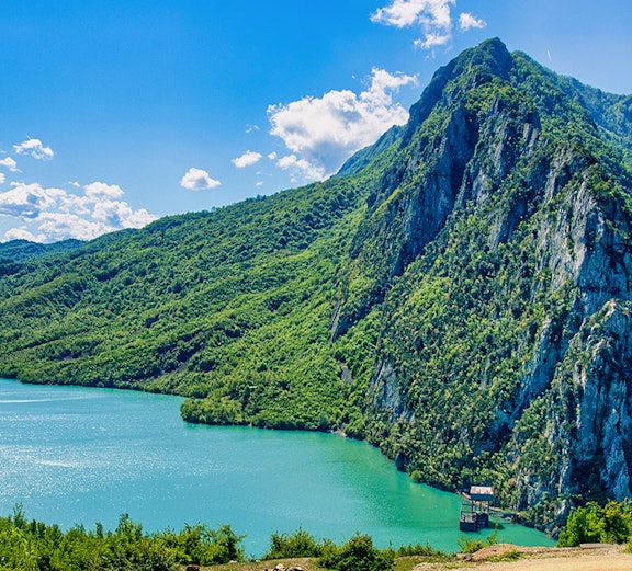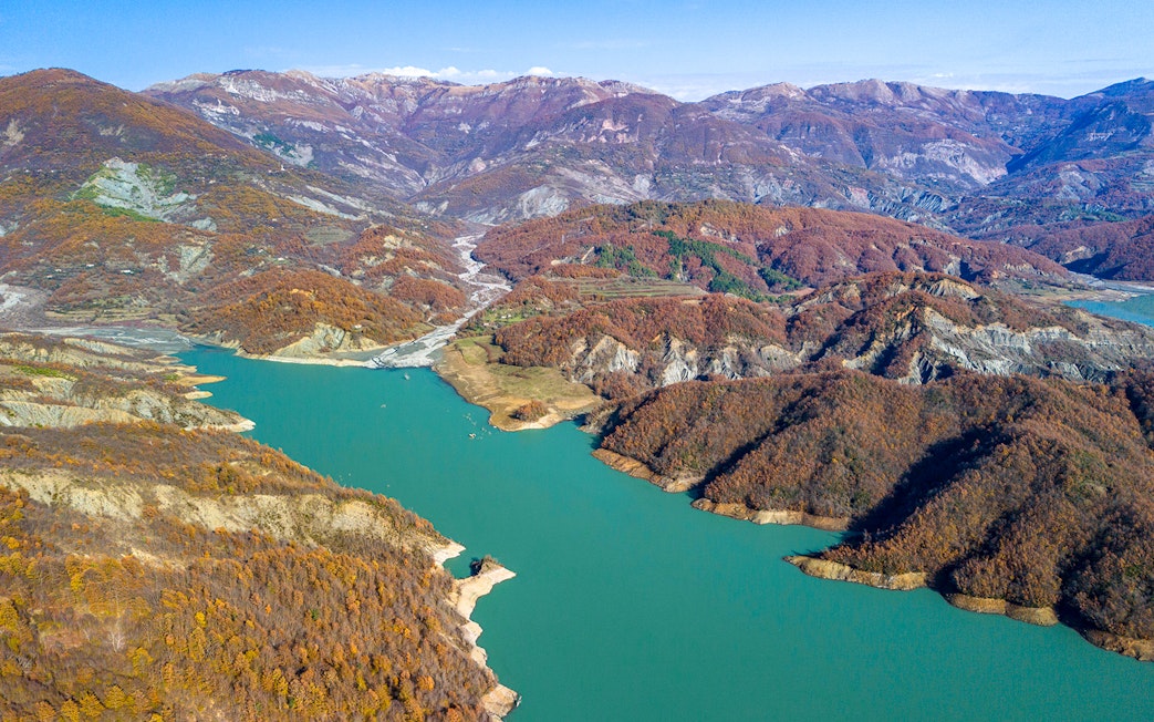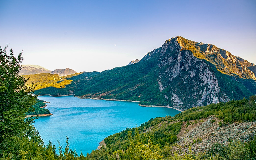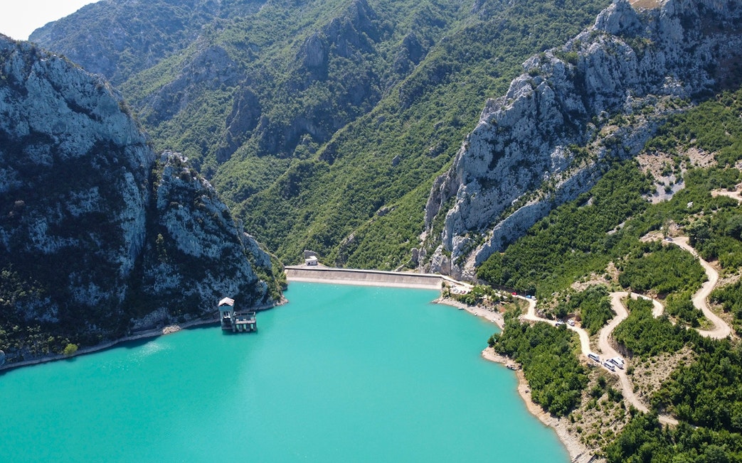 Zatrzymaj się, aby podziwiać żywą, niebieską taflę jeziora, zbiornik otoczony klifami, który do dziś dostarcza znaczną część wody pitnej w Tiranie.