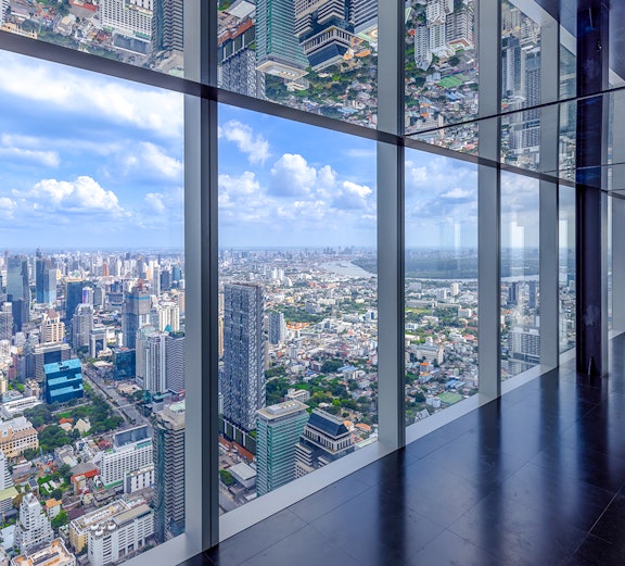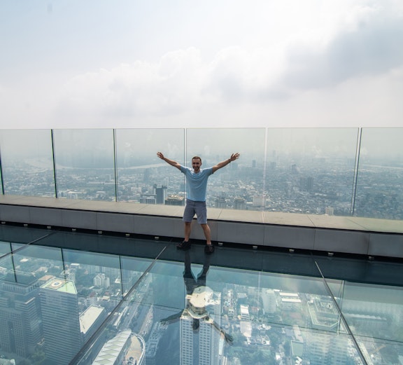 Wejdź na szklaną podłogę na wysokości 314 metrów nad Bangkokiem i podziwiaj zapierające dech w piersiach widoki na leżące poniżej miasto.