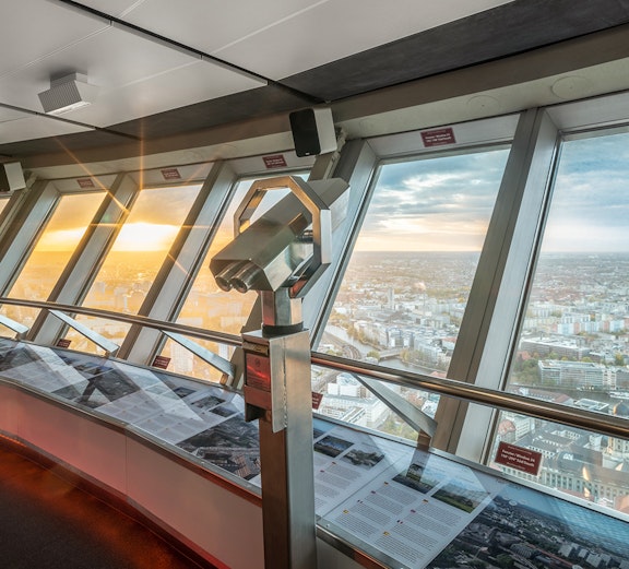 Wejdź na taras widokowy wieży i podziwiaj panoramiczne widoki 360°, dostrzegając punkty orientacyjne, takie jak Brama Brandenburska, katedra berlińska i Wyspa Muzeów.