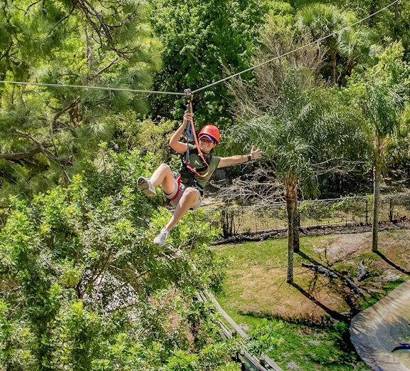 Ești dornic de emoție? Actualizați-vă turul pentru a vă înălța deasupra parcului cu experiența Screamin' Gator Zip Line și tiroliana de 1.200 de picioare pe mai multe linii timp de peste o oră.